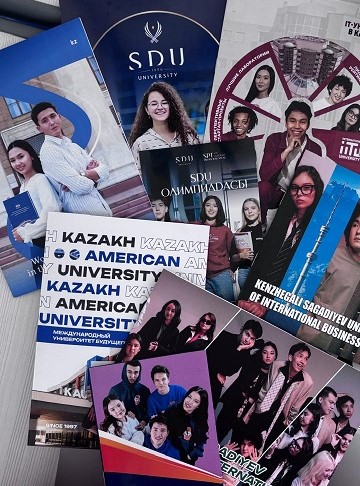 Next, the universities that visited our school began presenting themselves to the students. In total, eleven universities took part in the fair: SDU, Narxoz, KBTU, UIB, Ablai Khan University, MUIT, KazGASA, Kazakh National Women’s Teacher Training University, KAU, and DKU. My attention was particularly drawn to SDU, UIB, MUIT, and KAU, as journalism is included in their academic programs. By asking questions that had been on my mind for a long time, I received various informative answers and felt more confident about my future choice. In addition to gaining valuable information, I was also lucky enough to win several souvenirs.